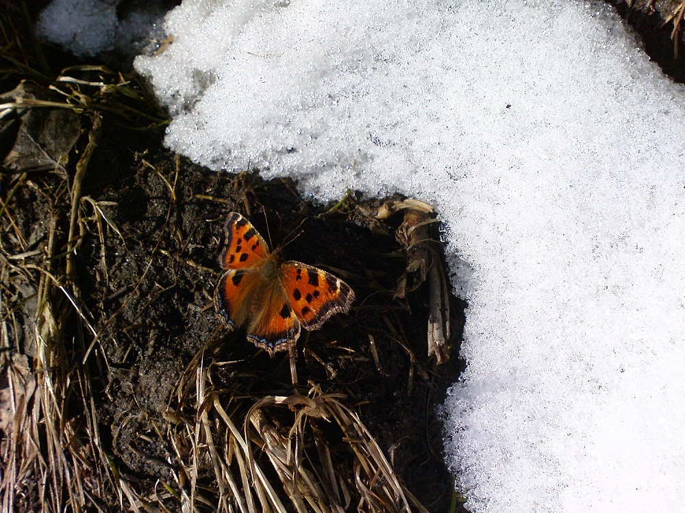 Любителям экзотики! Бабочки на снегу, коричневые на белом (практически) Но летают во всю, щёлкнуть в полёте не удалось, а вот когда налетавшись над сугробами присела отдохнуть, тут я её и щёлкнул
