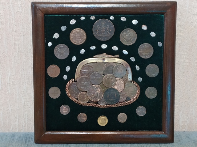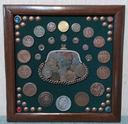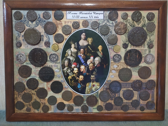 Лот №240: панно с имперскими монетами и бонами, размер 30 на 40 см. Около 15 монет копии (серебро, золото, сибирки, редкие года), остальное оригинал. Цена 5000+ пересыл ПРОДАНО