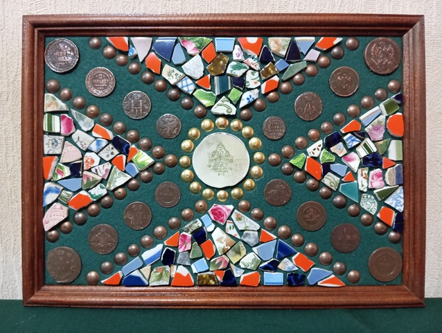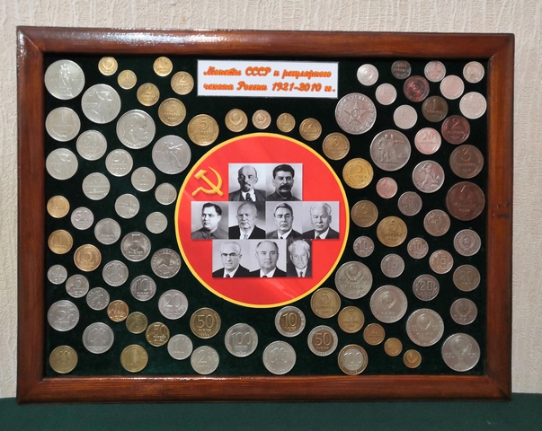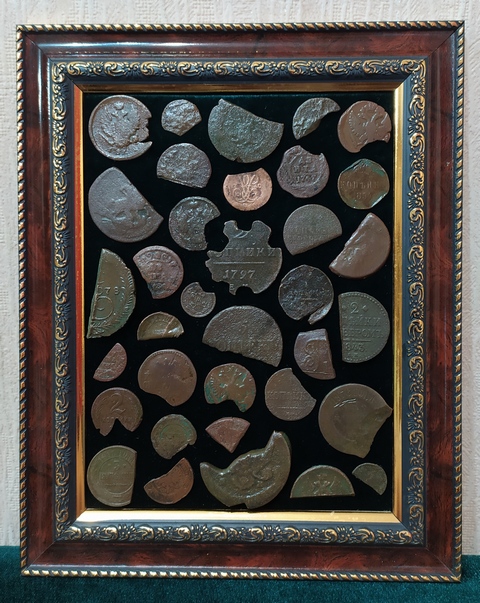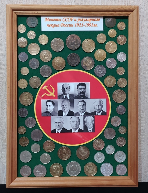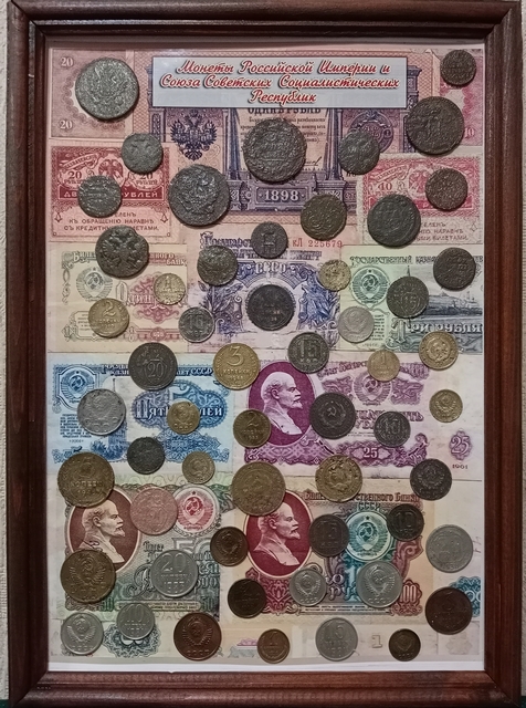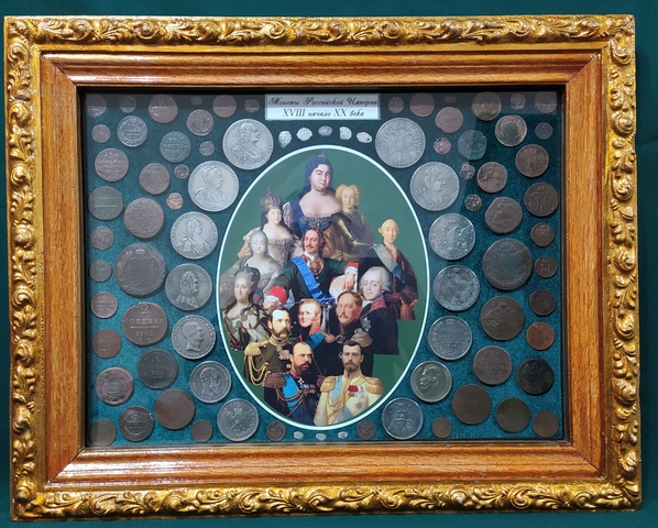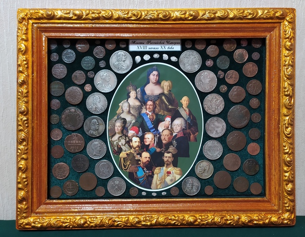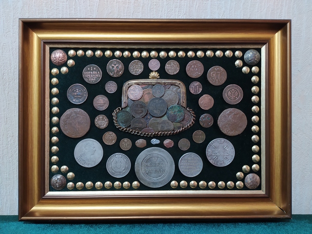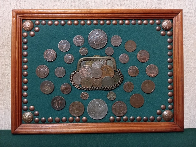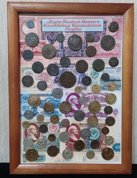 №350: панно с монетами РИ под стеклом, на рамке из СССР, в живую смотрятся красивше, рубли - КОПИИ. Одно фото без стекла, второе со стеклом (бликует, качественно не сделать), размер 47,5/37,5 см, цена 10000р. ПРОДАНО