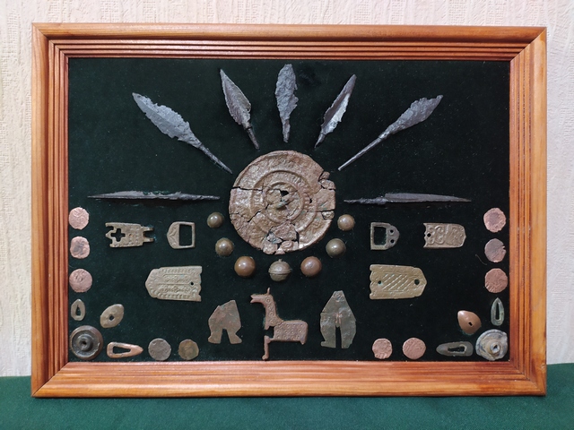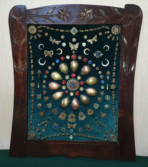 №380: панно "Украшения 18 первая половина 20 века", на многих позициях утерянные камешки подменены на современную бижутерию, Композиция расположена в старой деревянной рамке с казачьего хутора, размер 42/50 см, цена 12000+ пересыл