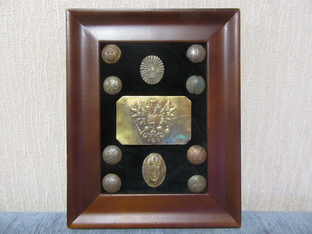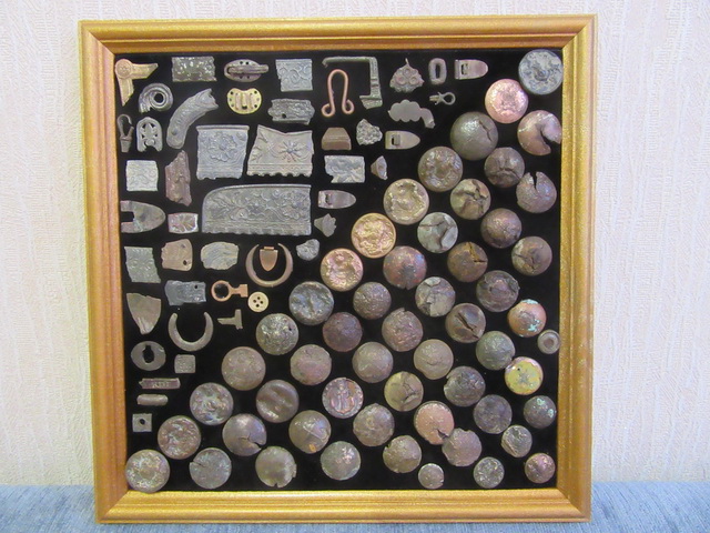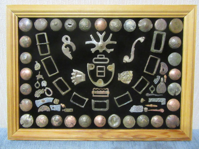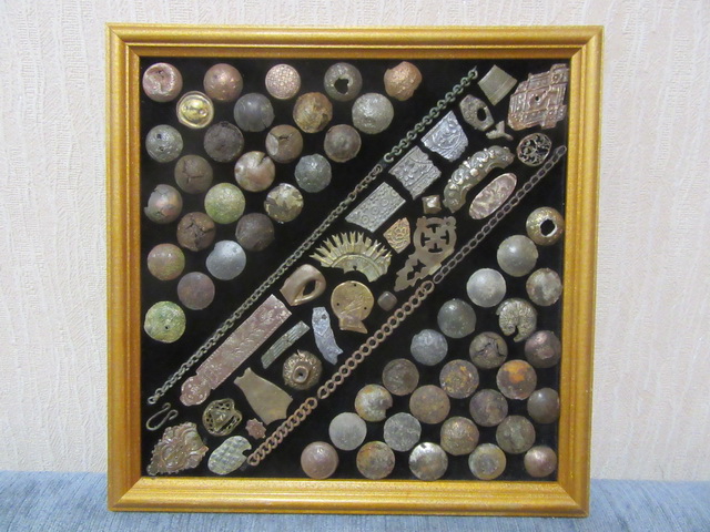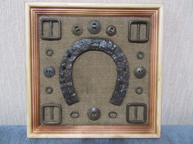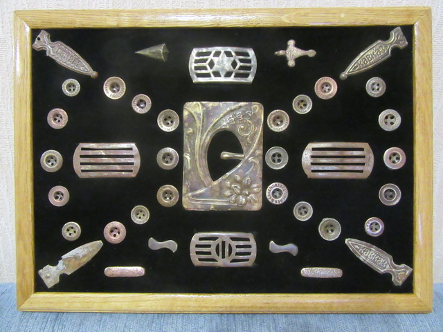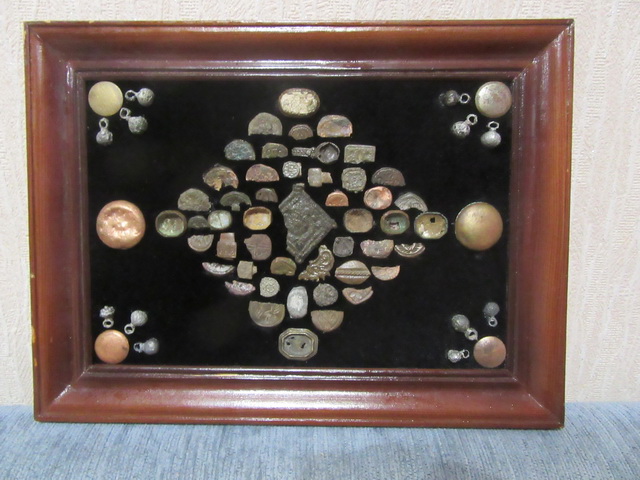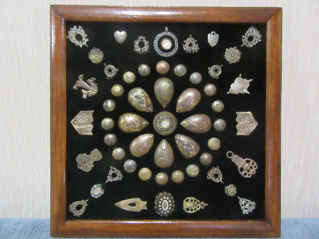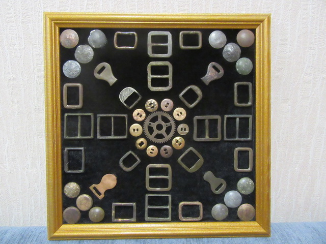 Лот №84: Панно с "травмированными" пуговицами в одном углу и фрагментами изделий в другом, размер 25 на 25 см,ПРОДАНО