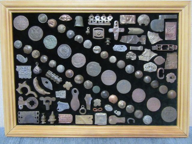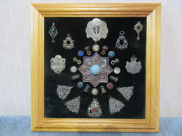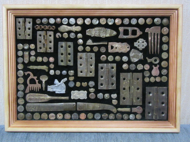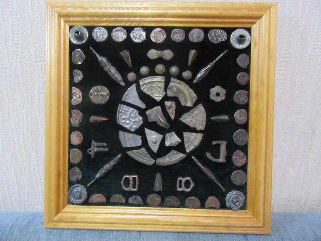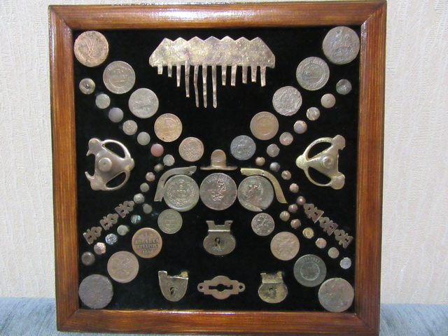 Лот № 127: панно с монетками и фрагментом гребня, размер 30 на 30 см.,ПРОДАНО