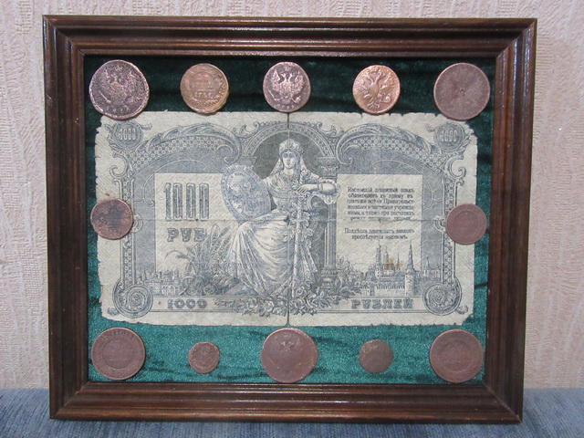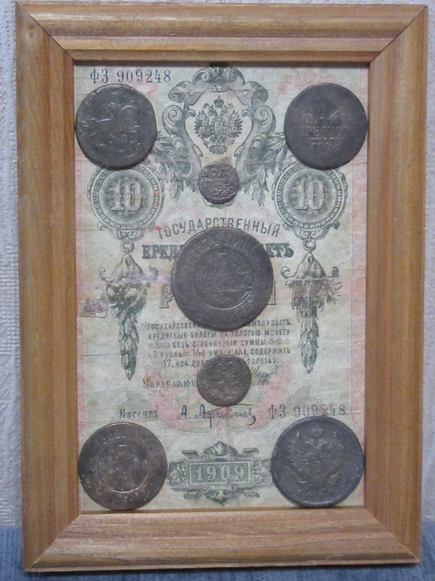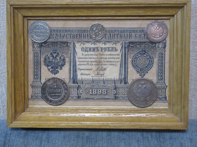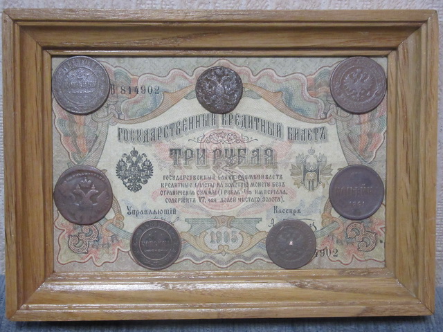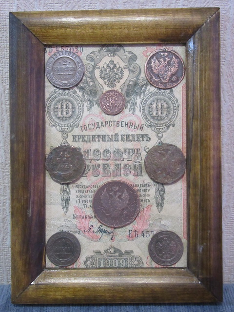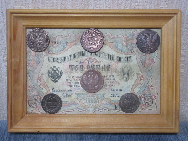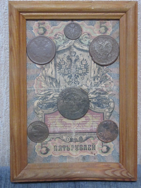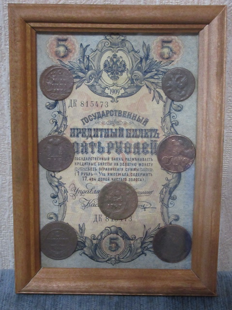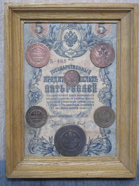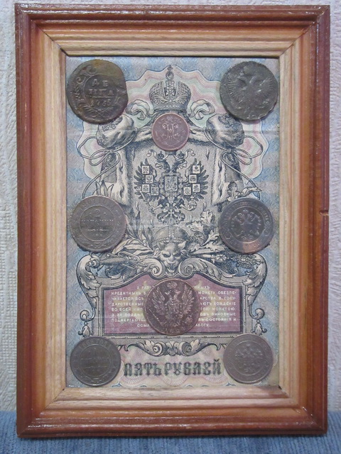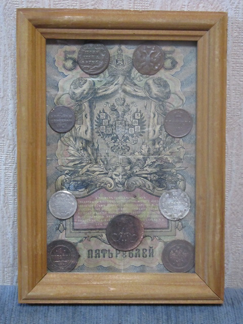 Лот № 151: панно с 5-ти рублёвой боной РИ и 6-ю медными монетами, ПРОДАНО
