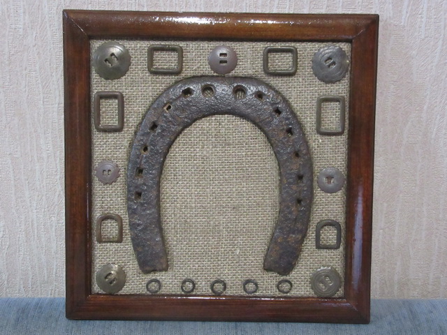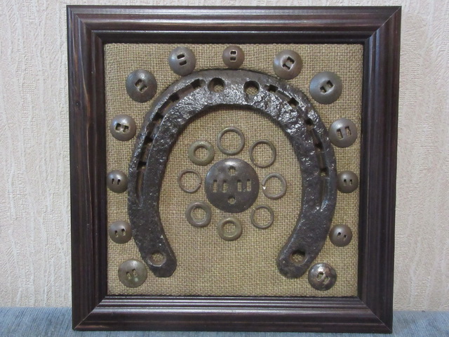 Лот №140: панно с подковой и колечками внутри, размер 25 на 25 см, продано