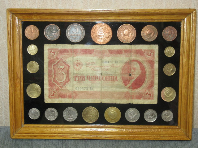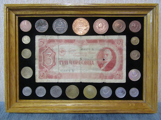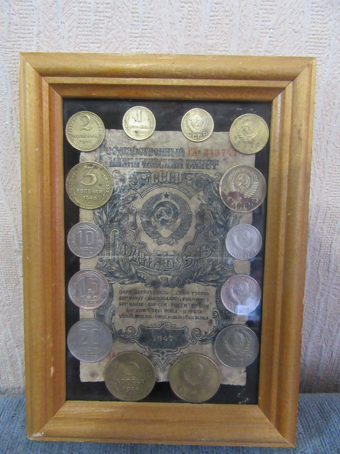 Лот №145: панно с рублём 1947 года и монетками, со стеклом, размер 25 на 25 см,ПРОДАНО