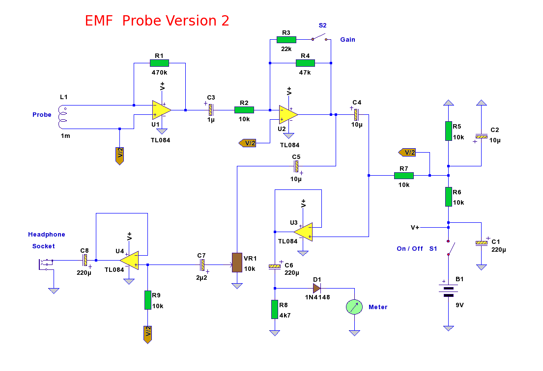 Были вопросы по поводу усилителя, чтобы сводить катушки. Так вот схема из будущей темы. Если Вы соберете себе такой пробник: ![]() то получите и искатель скрытой проводки, с индикацией на наушники и на стрелочный индикатор. А так же измеритель поля с помощью которого можете измерить насколько опасен Ваш детектор для вашего здоровья. А так же и усилитель, который нужен для настройки датчика. Сигнал можно снимать и после первого каскада усиления. А подавать вместо индуктивности, но через конденсатор 100Н. Печатная плата в формате LAY. Сообщение отредактировано Fuma: Feb 29 2012, 22:37 Вложенные эскизы изображений Вложенные файлы |