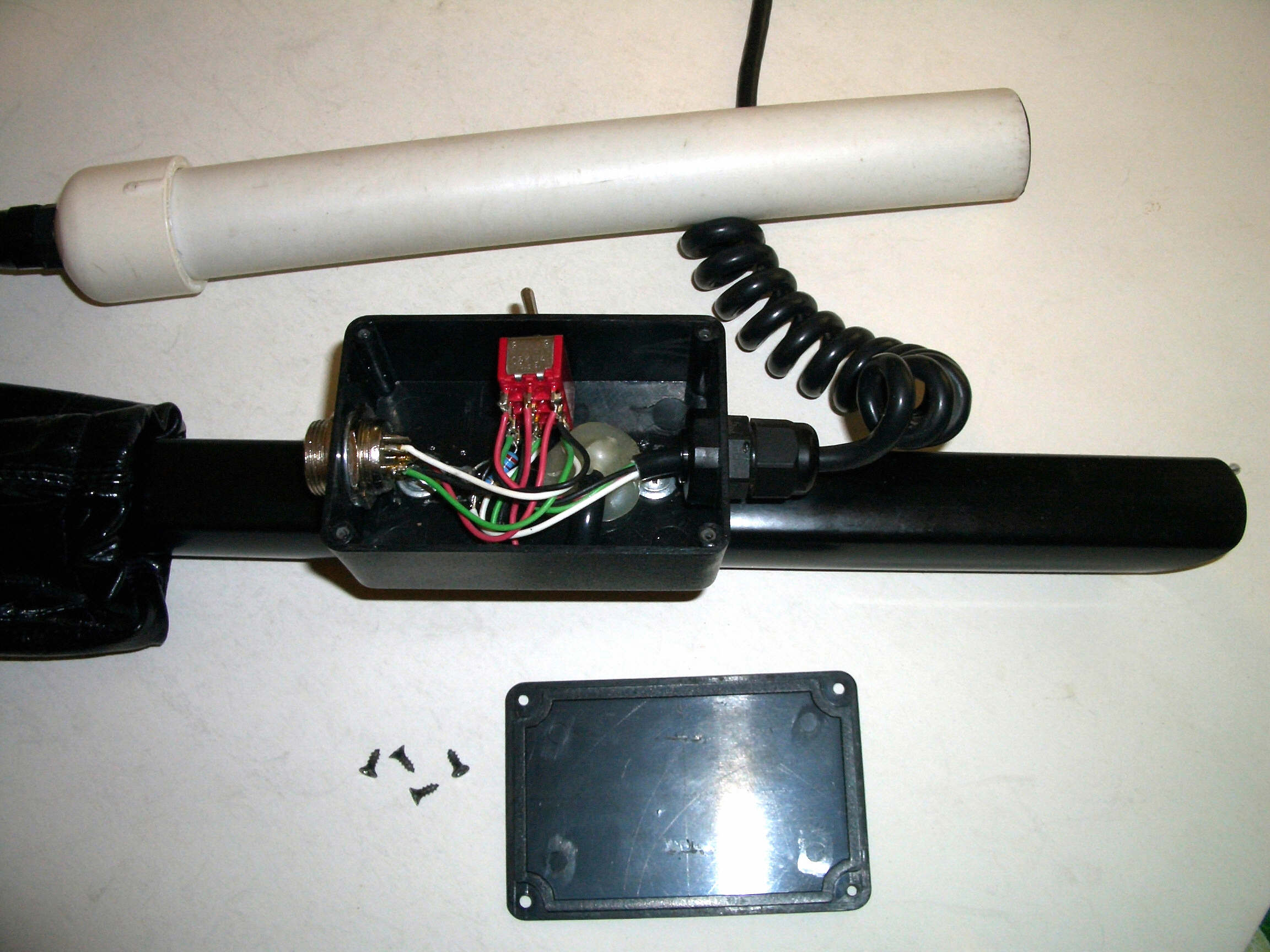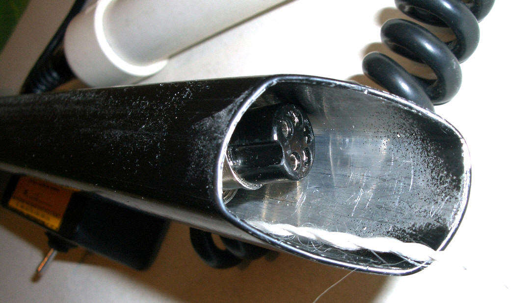 Да там отверстие в штанге от которого к прибору идёт кусок витого шнура.От катушки до коробки шнур не внутри а снаружи штанги намотан как на фишерах тёрках .чтобы можно ригулировать длину штанги.