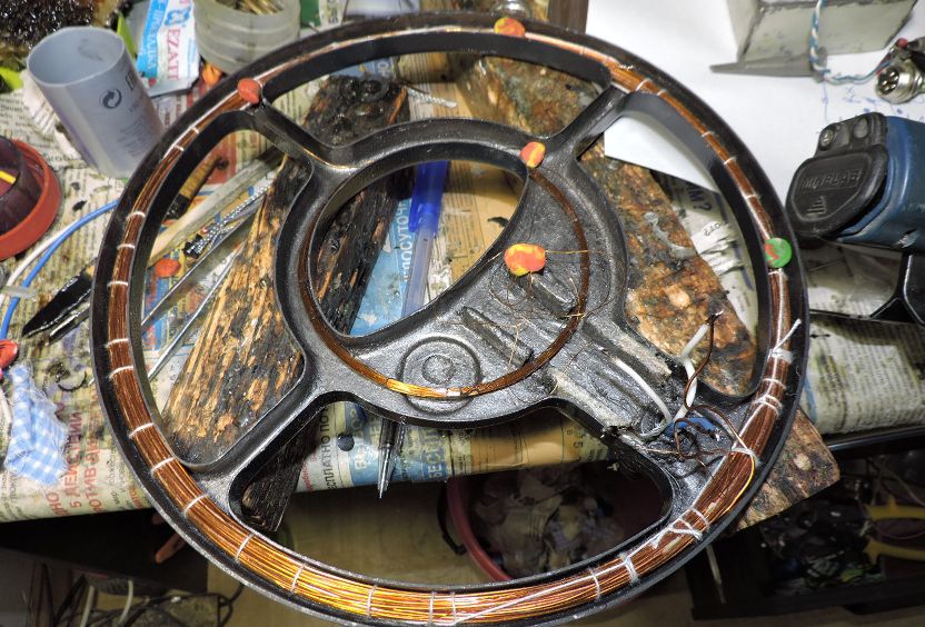 Катушку запустил. В виде как на фото катушка работает. Балансируется хорошо. Можно заливать. Дальность соответственно размерам. Кольцо можно сделать по двум вариантам. Первый Тх подключить напрямую, второй Rx подключить напрямую. Конструктивно для Е-Трака выбрал первый вариант, второй пробовать не буду. Может быть когда-нибудь потом. Чувствительность к мелким целям не выросла, как не видит крестик золотой ни одна катушка Е-Трака, так эта его не видит. Какие преимущества и недостатки выявятся у катушки, возможно расскажет ее будущий пользователь. Сообщение отредактировано Fuma: Jan 20 2017, 21:40 Вложенные эскизы изображений |