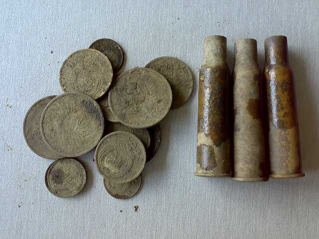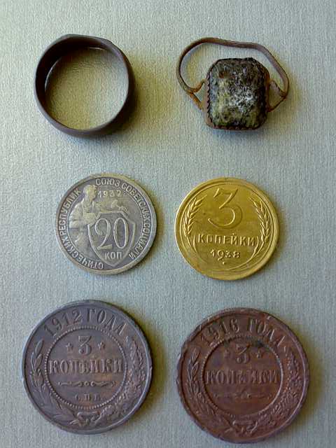В воскресенье, переждав ураганы и всеобщее затопление местности, проделав необходимую часть дачной работы, я стал с нетерпением думать о том, что хочу пойти копать. Сиболка застоялась в стойле и надо, надо было ее выгулять. Но куда податься? У машины моей накрылся глушитель, поврежденный еще весной, когда мы с Родственником штурмовали Калужские трясины, и поездка ранним утром явно не могла состояться. А что если… махнуть в лес? Дело в том, что сразу за моим участком начинается лес, в котором живого места нет от окопов и воронок. Войну я не копаю специально, но после того, как я заметил следы чужих лопат в нашем леске, мне стало интересно, что же можно там найти? Вот и пошел я, предварительно вылив на себя порцию ядов от клещей и сверху полирнув антикомарином. ![]() Первый сигнал поймал в тридцати метрах от моего участка, богатый, большой, и абсолютно не дискриминируемый – сразу ясно, вещь цветная и массивная. Копаю. Коп в лесу – это не на поле! Тут все совсем по-другому: корни, трясина, ветки лезут глаза и за шиворот… Вот и виновник звука: вылезает грязный конус, который перед фотографированием я мою в соседней луже: это головка от разорвавшегося снаряда – счет военным находкам открыт! ![]() Дальше прохожу, здесь идет два ряда давно затянувшихся землей, траншей. На освещенной солнышком полянке, опять ловлю сигнал, но странный какой-то – многоголосый… Копаем, для этого ведь, я пришел! ![]() Тут копается полегче, поскольку нет корней и сухо. Ой, что это круглое? Монетка! Ха, смотрим год… Не, это не военная, это дачная, кто-то из наших любителей огородов потерял! Проверяю ямку – опять сигналит! Вытаскиваю следующую! Но и это еще не все – опять сигнал и достаю копеечку, последнюю монетку в этом «кладе». ![]() ![]() ![]() Переправляюсь через затопленные остатки траншей, ловлю сигнал. Опять начинаю копать, прорубаясь фискарем сквозь корни… Ага, вот оно – опять головка от снаряда! Да, бои тут были серьезные!.. ![]() Прохожу дальше – тут, вдоль берега реки, вьется приметная тропинка. Берег в этом месте крутой и обрывистый, река остается на десяти метрах ниже. Сигналы поступают один за другим и я их отрабатываю по полной. Это гильзы. Русские гильзы. Сибола дает на них более грубый и яркий сигнал, нежели на монеты, поэтому я понимаю, что копаю, но копаю, поскольку на 20 гильз может и еще чего выскочить… ![]() Вот гигантская сосна, чудом держащаяся на самом краю обрыва. С этой точки отлично просматривается фарватер реки. И тут все усыпано гильзами – наш боец лежал тут, стреляя во врага… ![]() Но я рвусь дальше, туда, где тропинка вырывается из леса и бежит по берегу, виляя на живописной, освещенной долгожданным солнышком, поляне. Я давно думал про это место, как перспективное не только в плане военных, но и старинных находок, слишком уж красиво тут было. ![]() И тут ямы конкурентов встречались в изобилии, находки же были весьма однообразны – пояски от снарядов и гильзы. Прямо на склоне у воды ловлю сигнал, начинаю копать: песочек, копается легко и бодро. Из недр выныривает монетка! Опа, началось! И опять звенит, и опять! Вот так бережок выдался! Из одной ямки три монетки. Они близки к войне, но года выдают их тайну, по которой потеряшка эта - послевоенная. Видать, присел человек в брюках на травку отдохнуть, а что за карманы в брюках – гадость, сразу все и выкатилось. ![]() Продолжаю шерстить береж