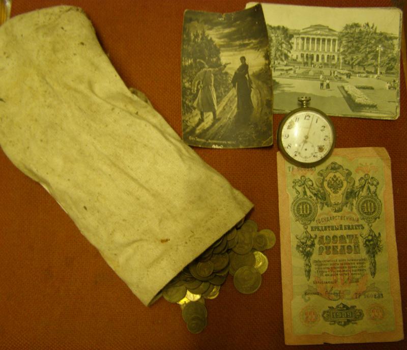 Но поднявшись на него - были несколько разочарованы - стропила, балки все старые - железо изнутри сияет новым блеском. а засыпка хоть и есть - но полностью мертвая. полный ноль. Спустились в комнаты. Там кавардак. Были и в подвальчиках. Итог: мои находки Государственный кредитный билет 10 рублей 1909 г. Дореволюционная открытка. Рукавица с монетами С рукавицей вообще смех был...нахожу ее - звенит!!! Тяжелая. Ну думаю все! а глазах Николаи ну или ранние советы ) высыпаю - а там 1,2, 3, 5, копеек 1970-1990-х годов! А у напарника - мешочек - высыпает - а там полевая керамика - кусочки черной белой . обливной керамики ))) Видно в полях собранная. фотик не брал с собой, находки сфотаю чуть позже. А вот и фото Сообщение отредактировано Rusaled: Oct 31 2013, 23:28 |