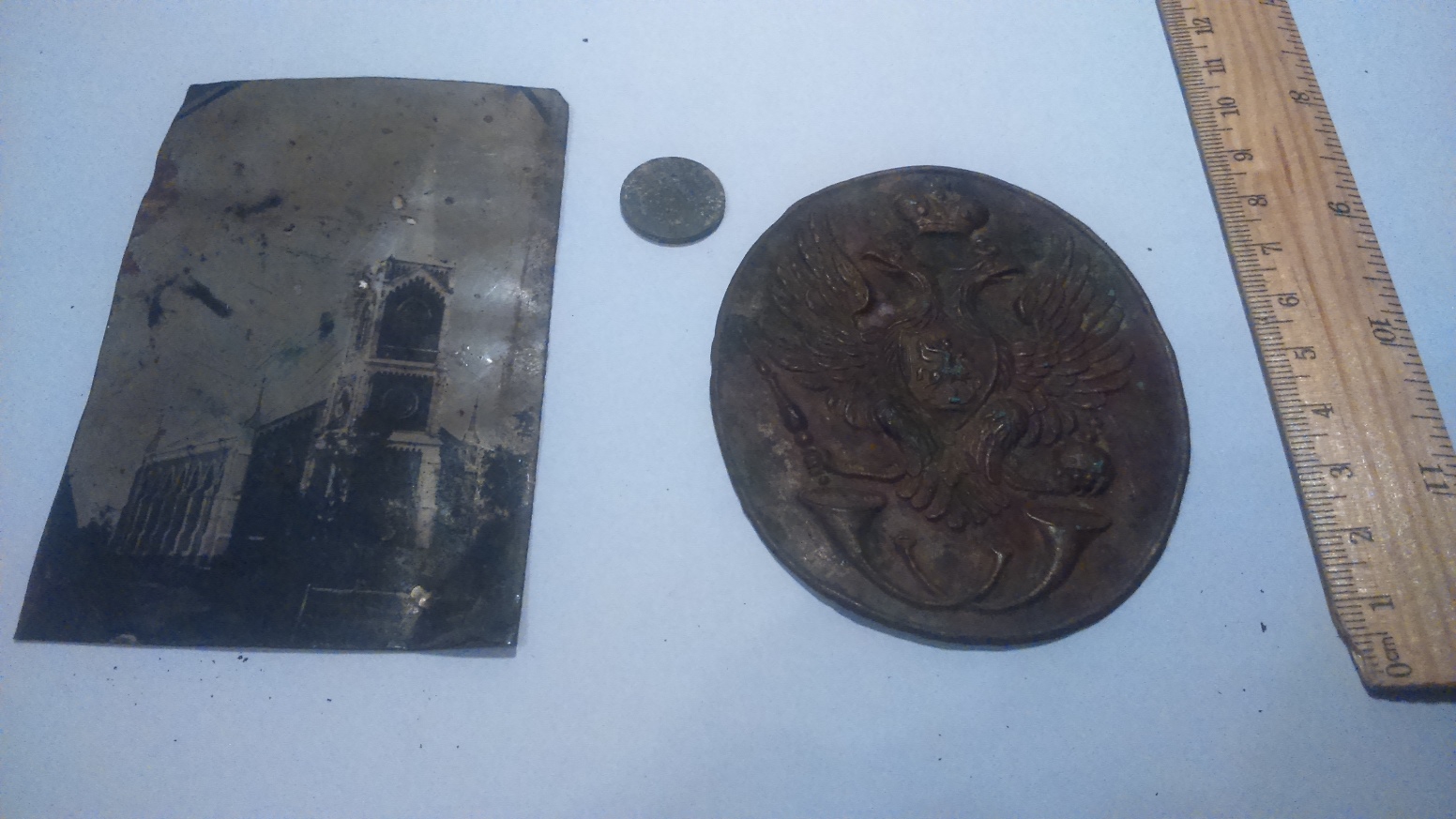 Несколько дней читал вашу тему взахлёб! Так как зимняя ломка очень сильная, неудержался и вчера съездил на брошеный домик недалеко от города. Раньше там бывал тоже, но примечательных находок не было, только киросиновая лампа, маслобойка, неочень старая радейка и несколько настенных советских часов. Чердак был несильно захламлён,крыша покрыта уже шифером, по углам раскиданы бутылочки и фуфырики, но ничего примечательного нет, так как все без рисунков, надписей и этикеток. Сам дом наверное 30-ых годов, может послевоенный, но место хутора обозначено ещё на верстовке, полуразрушенный старый амбар присутствует. Поставил машину подальше и с километр топал по глубокому снегу. Дверь оказалась открытой и я сразу на чердак. Первые 15 минут беглого осмотра мне не дали никакого результата, кроме как немецкого фенинга, латунных деталей от мебели и смятой сердцевины от керосиновой лампы. Немного освещённое место напротив окна "украшали" бомжацкие мины. Ещё раз бегло осмотрев чердак и решив что носиться из угла в угол с прибором не стоит, уделил внимание одному участку. Попалось пара ножей (сохран совсем не чердачный), металическая пластина с фотографией церкви, больше десятка подков и какой то знак, вроде почтовый? Интересно куда такой крепился? Фото прилагаю, буду рад если поясните. |