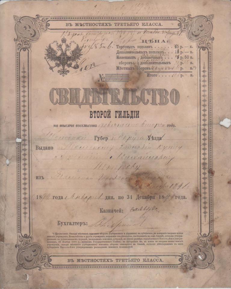 QUOTE(igor pahomov @ Sep 26 2012, 15:58) Здравствуйте коллеги.За время шатания по чердакам скопилась такая вот подборка.Предлагаю вашему вниманию. Находил на Липецком чердаке похожие документы, как и Ваши №2 и №3. Но мои были за 1882 год и для местности 4 класса. Документ №3 - это гильдийское свидетельство. По нему собственно купцы и являлись купцами какой либо гильдии. Например, на моих документах купцы второй гильдии. Т.е. купец платил указанную пошлину и ему выдавали эту бумагу на год, по которой он и являлся купцом второй гильдии. Бумага редкая, т.к. их очень мало сохранилось - у нас по Липецку таких гильдийских свидетельств не нашлось ни в музеях, ни в архивах. А в том доме, где они были обнаружены, на первом этаже был ими оклеен потолок под побелкой... но я, к сожалению, тогда ещё не представлял всей ценности данных бумаг и не стал заморачиваться с расчисткой, снятием или хотя бы фотографированием... Счета и прочие бумаги так же весьма интересны! -------------------- Пивная тематика до 1946г. и находки по Липецкому краю.
