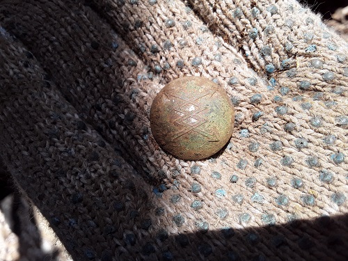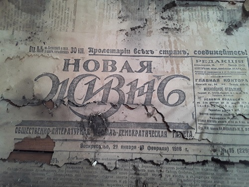 Поискал сегодня под полами в горелом доме. Советы, серебряный перстень, из царизма только пуговица. Из сети узнал, что такие пуги носили чиновники Телеграфного управления в 1858-1885 годах. Думаю, из-за пуговицы схожу туда ещё раз. Наведался снова в бывшую библиотеку. Вся стена сносимой пристройки обклеена меньшевистскими газетами "Новая жизнь" начала 1918 года. Интересно, что дата газеты указана в двух календарях. Забрал оттуда крышку "Королевскiя сельди" и кусок газеты.