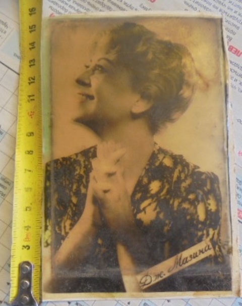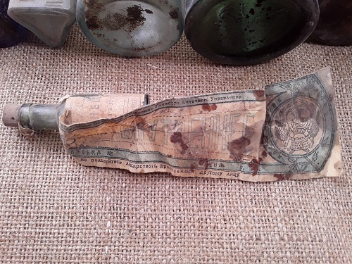 Из находок ещё - минералка Моссельпрома, 20-х годов, аптекарский пузырёк с гербом империи, пузырёк ТЖ, Тройной одеколон, как будто из магазина (сохран этикетки просто бомба!), несколько интересных ёлочных игрушек, открытки, пузырёк-гроздь из Риги от духов Дзинтарс, гирька, опять же с имперским гербом и клеймом поверки, марионеточный смешной и усатый дед в валенках, простынка 100 рублей 1947 года, книжка П.Дыбенко 1923 года про мятежников (пока не знаю, каких) и остальное.