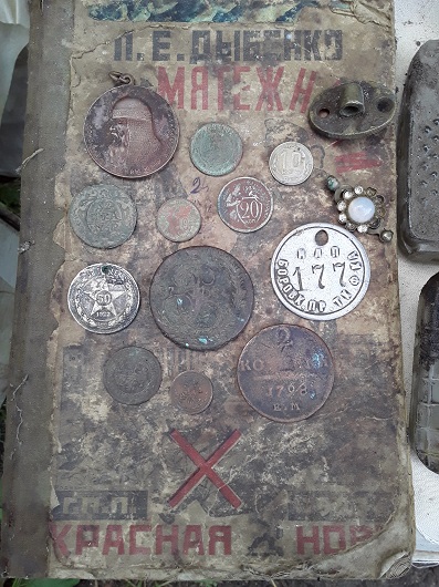 Вот что значит, правильно распланировать праздничный день. С утра с товарищем отправились на поиски, и чердаки в двух заброшках, как говорится, "выстрелили"! Самая большая и необычная находка - это четверть Товарищества Попова. Первый раз такую находим и видим. Полтинник РСФСР тоже нечастая находка, поэтому радостная, несмотря на замшелый вид. Удивили пятак Екатерины Великой и другие имперские монеты на дне сундука, под подстилкой - видимо, были положены туда в дань обычаю, чтобы деньги водились в доме. Один шкафчик был изнутри обклеен дореволюционными открытками и вырезками из журналов, - такое встречаем весьма нечасто. Наконец-то поняли, где крепилась "конина", попадающаяся в полях. Хомут, начинённый соломой, а по краю шла кожаная полоска как раз с этими конинками. Все они соединены кожаной полосочкой.