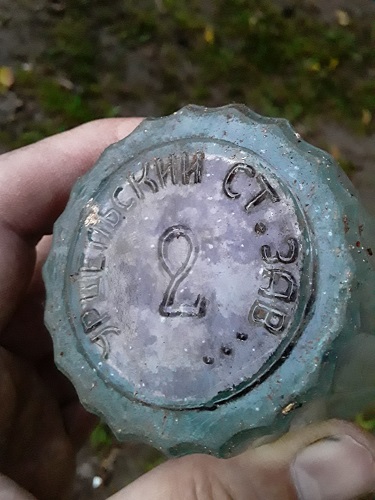 Разбирал находки, и при помывке стекла от керосиновой лампы попытался оттереть, как мне показалось, след от наклейки. На свету оказалось, что это клеймо в виде герба Российской империи. А я его содой!!!