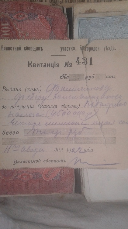 Две банкноты 1918 г., две банкноты 1919 года и девять дензнаков 1921 года, на общую сумму 472 т.р.! В книжке лежала также квитанция от августа 1922 г., волостного сборщика налогов с теми же ФИО, как и в предыдущих документах. Какой налог, я не разобрал, но насобирал этот сборщик, судя по квитанции 4,5 млн рублей. Дальнейшая судьба сборщика и этих миллионов покрыта мраком Вложенные эскизы изображений |