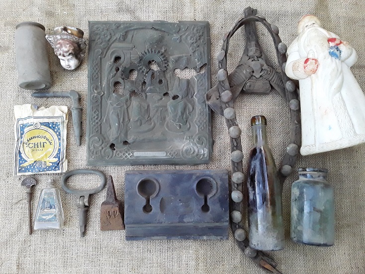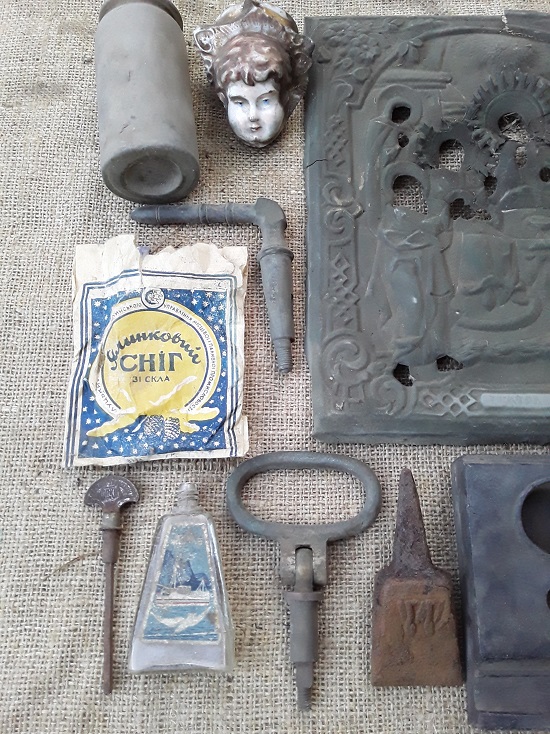 Вызвали вопросы кожаные предметы, видимо из конской упряжи? Г-образный вентиль и железная штука с треугольной вершиной тоже непонятного назначения. Ручка с клеймом "Красный труженик Москва" оказалась вертелкой от дверного механического звонка. Она вставлялась в накладку с написью "Прошу повернуть". Вложенные эскизы изображений |