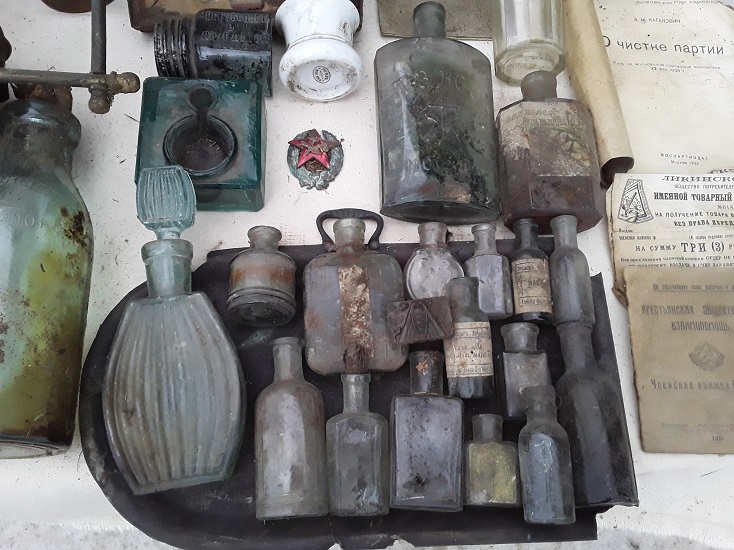 Отчёт по вчерашним находкам. Две керосиновых лампы с подвесом. На чердаке увидел на них двуглавого орла, подумал, что наши. Оказалось, что орёл другой империи, Австро-Венгерской. Чернильница завода имени Первого коммунистического добровольческого отряда (бывший завод братьев Курженковых). Пузырьки периода НЭПа, один из них интересный - Общество Мосгубсовета Друг детей. Стопка с клеймом на донышке "Красный май".