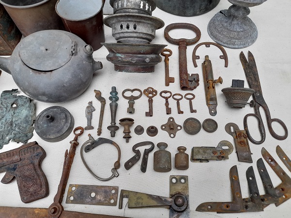 Приветствую.. Сегодня опять пошёл в то место, где вчера пыль поднимал... Походил сначала рядом, с того бока где небыл.. Там джунгли выросли, это плюс, но то что там мусора навалено, это конечно минус.. Помыкался, там немного, потыкал снайперкой, 5коп 1961г,кусок латуни и бирку с клеймом поднял, и то барыш... Подумал-прикинул и снова полез на второй этаж в дом и чердак.. Вдруг ещё что по невниманию оставил.. На чердаке только фантик конфетный подня и всё.. В квартире, лопатой, замочки с ящиков шкафа добрал, С изразцов латунные накладки... Да, когда лез через окно то в подоконнике заметил темное пятно железки посредине, отодрал, оказалось кусок монеты 3коп.империя..Ещё немного радости хапнул, когда в нычковом месте вслепую рука нащупала железную коробочку, хоть и легкую но там что то позвякивало..