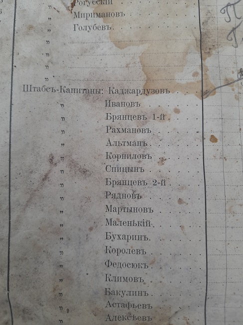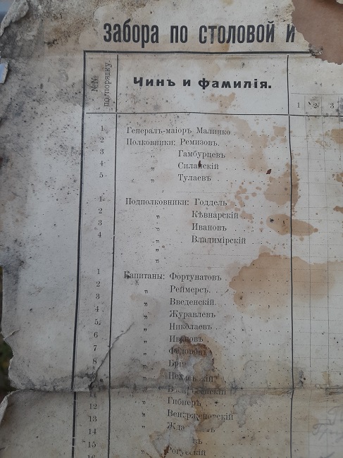 Интересный документ с того же чердака. Лист взносов на столовую и буфет офицерского собрания 7 гренадёрского Самогитского полка. В листе перечислены все офицеры полка от генерал-майора до прапорщика и несколько гражданских чиновников. Датируется документ 1910-ми годами. Впоследствии он использовался ребёнком как тетрадь.