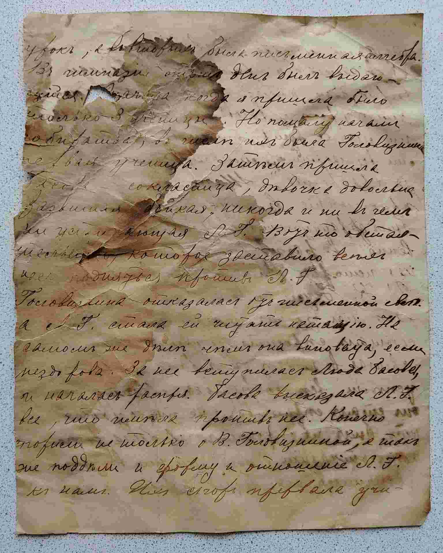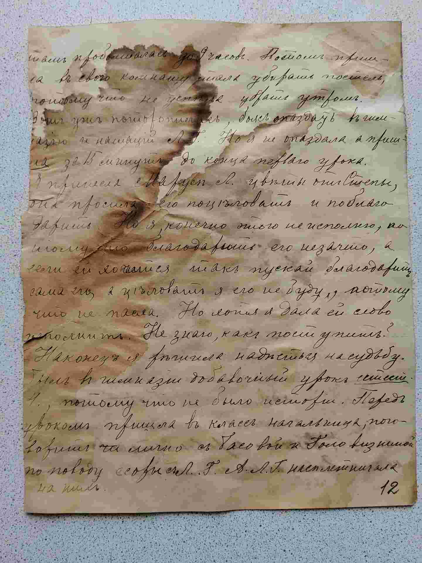 .... провалялась до 9 часов. Потом пришла в свою комнату, стала убирать свою постель, потому что не успела убрать утром. В общем уже поторопилась, боясь опоздать в гимназию и нотации Л. Г., но я не опоздала, а пришла за 15 минут до конца первого урока. Я принесла Маруси Л. цветы от Степы, она просила его поцеловать и поблагодарить. Но я, конечно этого не исполню, потому что благодарить его не за что, а если и хочется так пусть благодарит сама его. А целовать я его не буду, потому что не пасла. Но хотя я дала ей слово выполнить. Не знаю как поступить? Наконец я решила надеяться на судьбу.