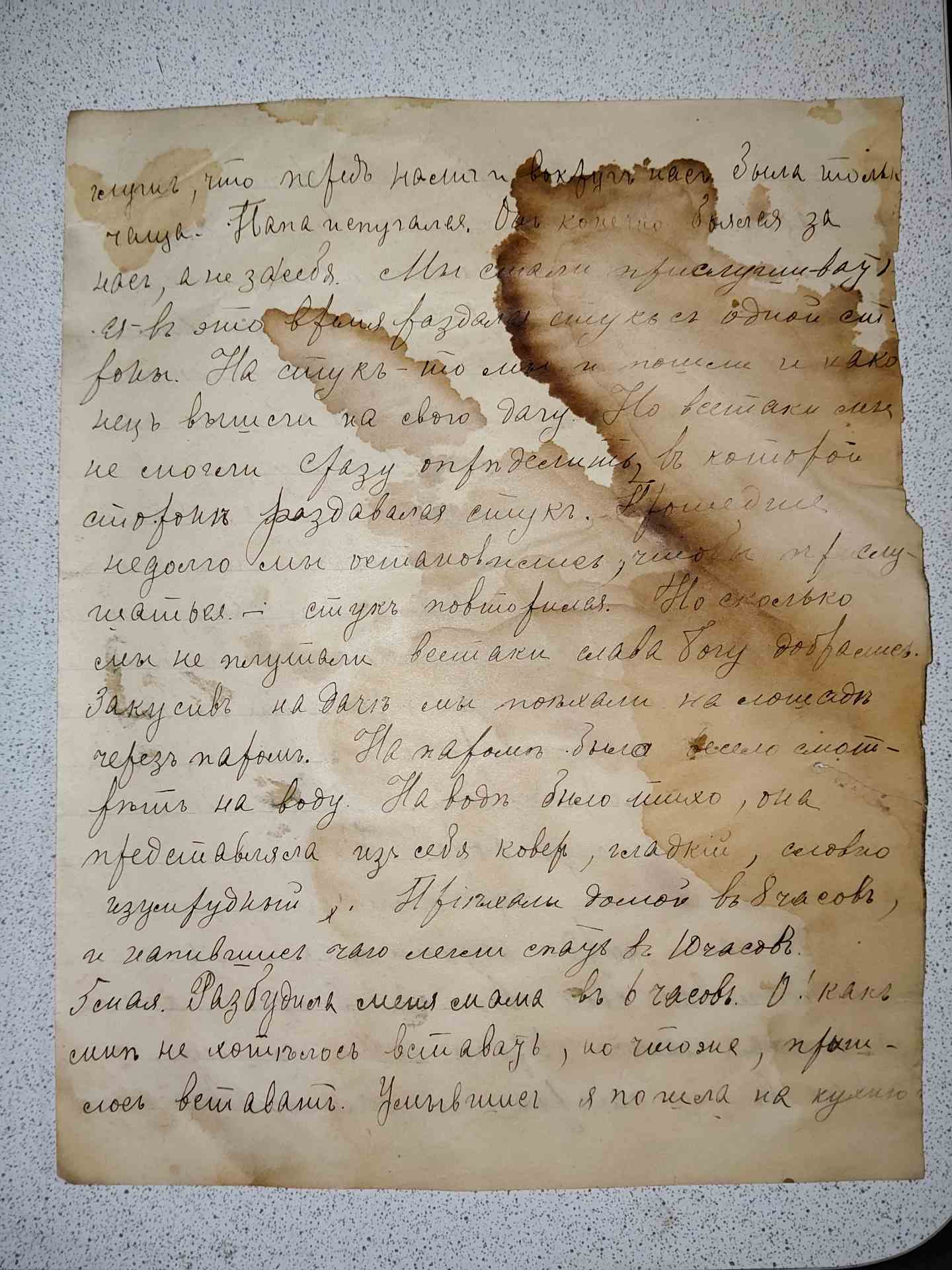 Перед нами гордо возвышался лес и протягивая свои ветви вперёд, как бы заграждая нам дорогу. Мы пошли, но не в ту сторону и зашли самую глушь, что перед нами и вокруг нас была только чащя. Папа испугался. Он конечно боялся за нас, а не за себя. Мы стали прислушиваться. В это время раздался стук с одной стороны. На стук-то мы и пошли и наконец вышли на свою дачу. Но всё так мы не могли сразу определить, в которой стороне раздаётся стук. Про... недолго мы остановились, чтобы прислушаться-стук повторился. Но сколько мы не плутали всётаки слава богу добрались. Закусив на даче мы поехали на лошаде через паром. На пароме было весело смотреть на воду. На воде было тихо, она представляла из себя ковёр гладкий словно изумрудный. Приехали домой 8 часов и напившись чаю легли спать в 10 часов. 5МАЯ. Разбудила меня мама в 6 часов. О! Как не хотелось вставать, но что же, пришлось встать. Умывшись я пошла на кухню. |
