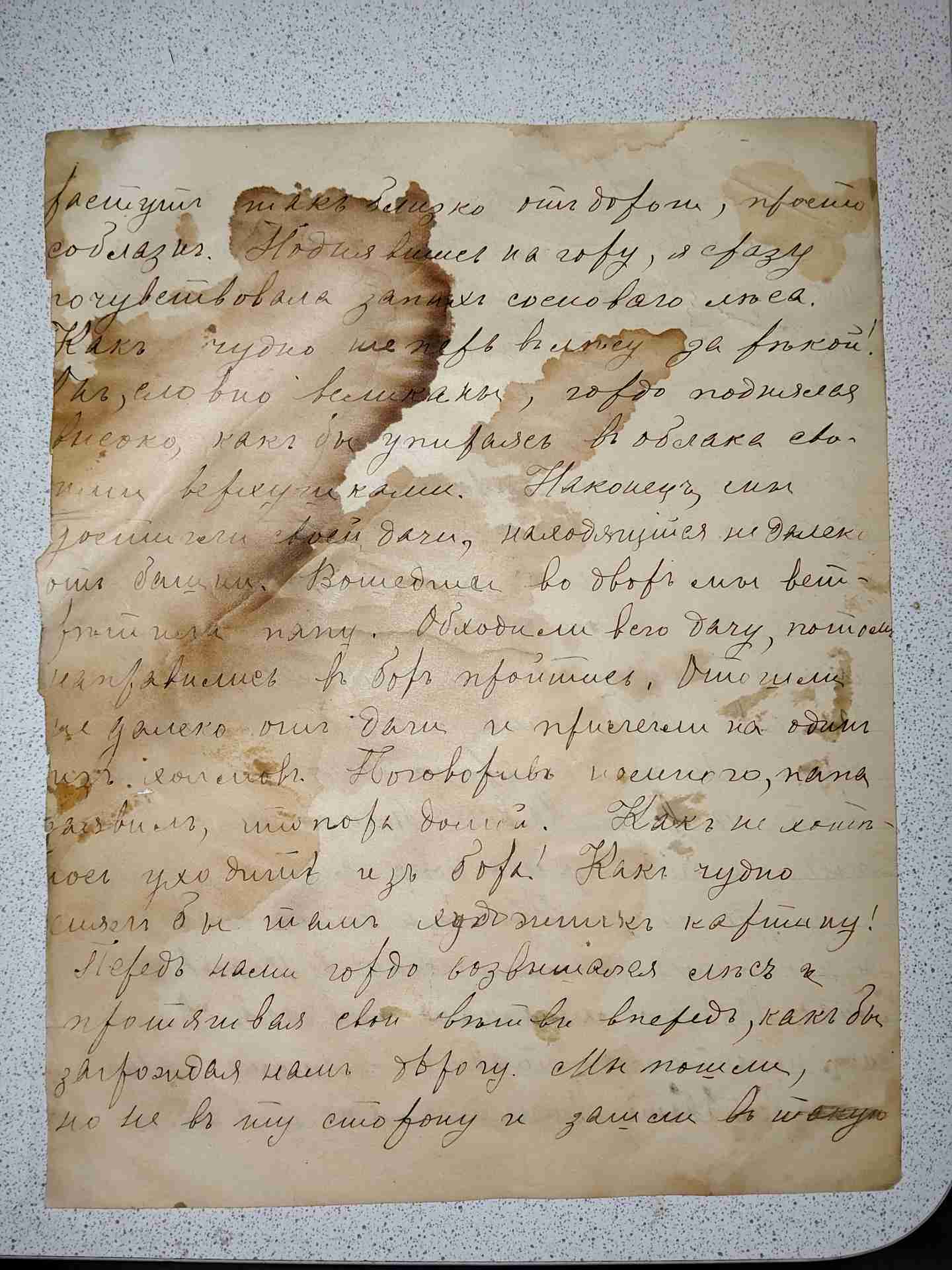 растут так близко от дороги, просто соблазн. Поднявшись на гору, я сразу почувствовала запах соснового леса. Как чудно теперь в лесу за рекой! Он, словно великан гордо поднялся высоко, как бы упираясь в облака своими верхушками. Наконец мы достигли своей дачи находящейся недалеко от башни. Вошедшие во двор мы встретили папу. Обходили всю дачу, потом направились в бор пройтись. Отошли далеко от дачи прилегли на один из холмов. Поговорив немного, папа заявил, что пора домой. Как чудно снял бы там художник картину. Как не хотелось уходить из бора