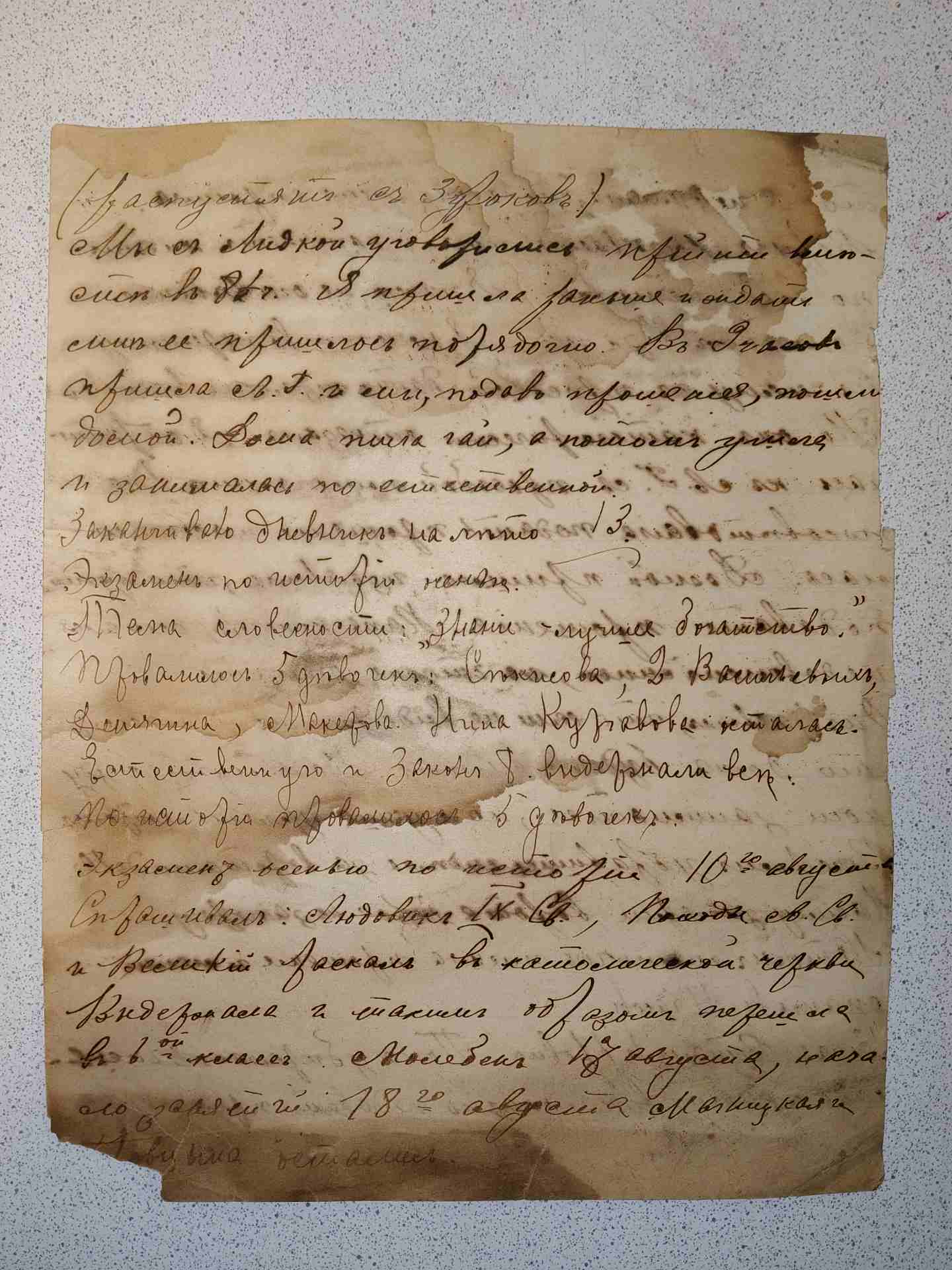 Вдруг вызывает меня и начинает гонять по всей истории. Я конечно не ответила, он мне 2 за год. Я, конечно в перемену к нему с просьбой:дать экзамен весной. Но он категорически отказал. Я обратилась к Л. Г. с просьбой помочь мне. Она посоветовала подать прошение и я согласилась. Домой пришла и заявила, что нужно подавать прошение. Папа, конечно, остался недоволен мной, но что делать. Он заявил, что то если не выдержишь экзамен, то дома будешь сидеть. Но я лучше буду ночи заниматься, но лучше гулять летом. Вечером убравшись сидела за воротами до 10 часов. На силу заперли ворота трое на запорку. Потом мамочка писала прошение и легла спать в 11 часов. 13 Мая. Встала в 6 ровно. Пока убиралась 8 часов- надо идти в гимназию подавать прошение (распустят с 3 уроков) Мы с Лидкой уговормлись прийти вместе в 8 ч. Я пришла раньше и ждать мне её пришлось порядочно. В 9 часов пришла Л. Г. и мы подав прошение пошли домой. Дома пила чай, а потом, ушла и занималась по естественной. Заканчиваю дневник на лето 13 Экзамен по истории.... Тема словестности : "Знание-лучшее богатство." Провалилось 5 девочек: Стежова, 2 Васильевич, Деничина, Макарова. Нина Куравова осталась. Естественную и Закон Б.. выдержали все. По истории провалилось 5 девочек. Экзамен осенью по истории 10го августа Спрашивал: Людовик 9 св., Походы св. Св. и великий раскол в католической церкви. Выдержала и таким образом перешла в 6ой класс. Молебен 17августа, начало занятий 18го августа. Маницкая и .. вцина остались. Сообщение отредактировано pavelstatnik: Сегодня, 17:08 |