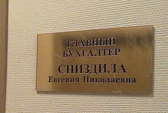 "Росграница"...бывший руководитель Дмитрий Безделов; объявлен в федеральный розыск по делу о хищении миллиарда Один из замминистра экономич.развития РФ Андрей КЛЕПАЧ Антон КРИВОРОТОВ, врач-стоматолог ("О самом главном" Россия1) Владимир ПИНДЮР, ГИБДДэшник... (пиндюр от гл."пендюрить", т.е., много есть, быть лентяем и дармоедом) ЗЫ никого не хочу обидеть, просто совпадения такие... Продолжайте коллекцию, друзья. -------------------- дайте мне цель, и я переверну землю...на штык.