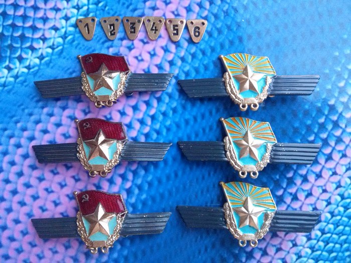 14. нагрудный знак "За сверхсрочную службу: для сухопутных войск тяжелый/эмаль/заколка и авиации легкий/эмаль/заколка. Подвесы к ним (цифры), те что на фото. На знаке с красным знаменем колечки для крепежа подвеса есть, на полосатом отсутствуют. Любой знак 150руб.+пересыл от 80руб., подвесы по 20руб. 1шт. Знаки новые не из оборота. Оплата на карту СБ, лоты в Санкт-Петербурге. ПРОДАНЫ!!!