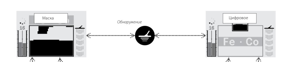 Ещё можно "поджать" железо внизу на маске, т.е. закрасить на маске немного экран снизу. Таким образом цветмет будет выделен в большей мере. При этом над железом постоянный фон прибора будет затихать исчезая полностью и прибор будет бубнить на железо, что повысит достоверность определения предмета. Но, надо сказать, некоторые сильно ржавые предметы и, особенно круглой формы, всё равно будут отдавать в цвет. Сообщение отредактировано Maxbout: Nov 10 2013, 12:01 -------------------- Беспощаден в желании помочь