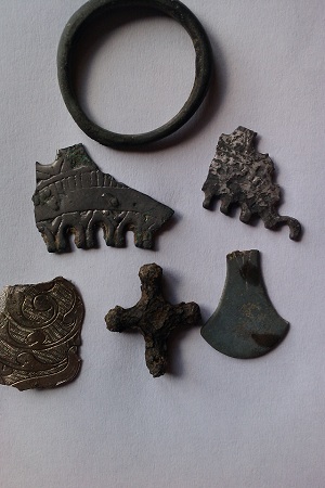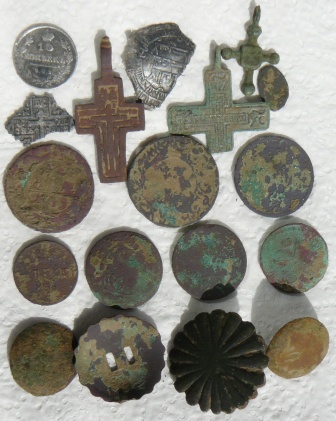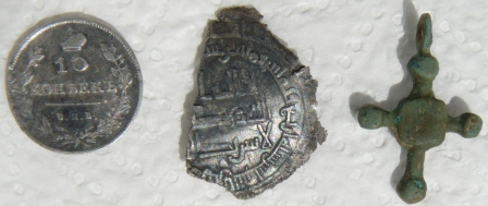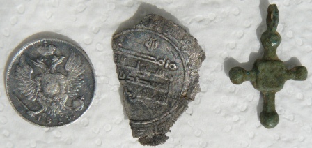 Выбрался на этих выходных на старое исхоженное место. Клеща аж 2 штуки на штанах. Нашел старый значок СССР про олимпиаду, 2 монетки СССР, половину крестика, вот так. |