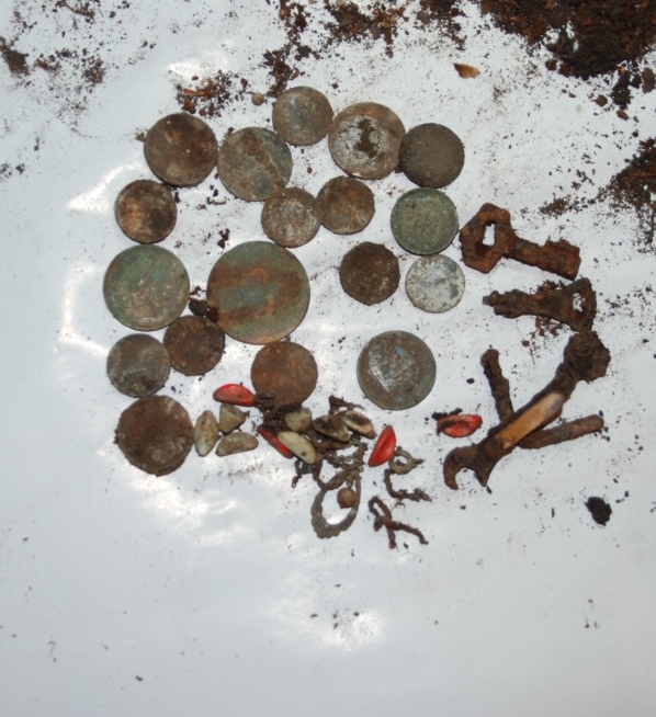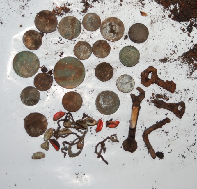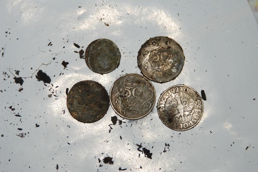 Ну вот и всё!Монеты разные,польские,немецкие,советские.Все довоенные.Еще была цепочка и остатки чего-то непонятного.Бедный был человек.Монетки малёха почистю и отпишусь.