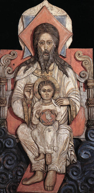 Вот какое нашел изображение Ангела, Богомладенца и голубя. Не могу понять чей образ подразумевается в изображении Ангела. Это просто Ангелы, собор Архангела Михаила. Ветхозаветная Троица - Ангелы с крыльями, может на складне Господь Саваоф оттуда. |