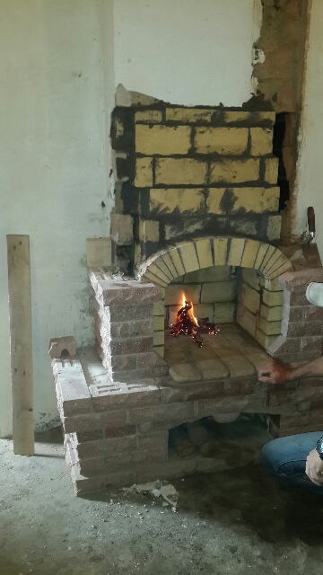 Всем здравствовать! Сегодня врезался в дымоход,произвел контрольную топку бумагой и картонными ящиками. Тяга отличная,не дымит. Осталось облицевать и все готово!