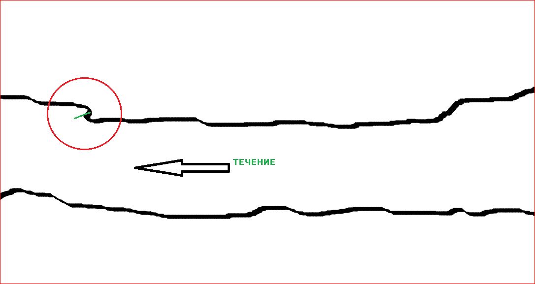 Знаю одного рыбака, удачно специализирующего на ловле язя и при том только крупного. На местной малой реке находит 3-4 места сразу с глубиной у берега примерно 1.5 метра, выдающим береговым уступом или резким ступенчатым перепадом береговой линии (как на схеме), где есть отбойная струя, а за ней в сторону берега, тихо. Приваживает пареным горохом. Приходит по утру, садится на одно из мест с одной удочкой, бросит с десяток горошин, удочку держит только в руках и ловит исключительно на горох. Поймав одного, или не дождавшись поклевки в течение 30 минут переходит на следующее прикормленное место и так далее. Обычно, если все хорошо, поймав 3-4 язя уходит домой. Вложенные эскизы изображений |