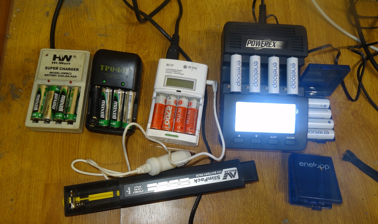 Вот мои зарядки, в той последовательности как я их приобретал. Первая заряжает маленьким током, не понравилось- долго. Вторая заряжает быстро, но не отключает заряд и нет функции разряда. Третья и разряжает перед зарядом и заряжает быстро каждый слот отдельно, есть индикатор заряда и автомобильный адаптер. Но один слот уже отказал. Короче раскошелился на Maha9000 (2550 рублей с доставкой) и энелупы 1520 рублей, теперь аккумуляторы можно разложить по косточкам, а потом собрать в лучшем виде. Кстати Maxell 2500 а/ч, после года использования перестали заряд держать. Хотел уже выкинуть и замену купил. Но после того как я их зарядил Mahoй , они целый день исправно работали и ещё по 500 в них ёмкости оставалось. Я потом измерил оставшуюся ёмкость, такая вот умная зарядка. А всего в них от заявленных 2500 а/ч осталось 1800-2000., после года эксплуатации. Зато цена у них 100 р. за штуку. Теперь энелупы лежат без дела.