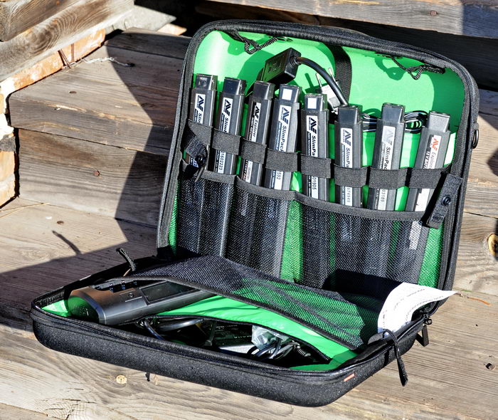 Maha Energy зарядник на 8 батарей с возможностью быстрой зарядки, обычной и восстановительной. В США/Ebay $70 (торчит из чемоданчика) и два комплекта аккумуляторов Maha Powerex 2700 по 8 штук - $30 каждый. Ну и 7 обычных аккумуляторов с зарядкой сразу на 4. Вот как-то так
