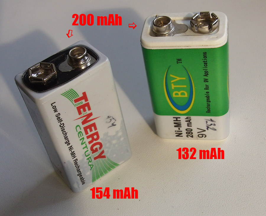 На майские праздники было время и удалость протестировать на "хоббийной" зарядке китайские "кроны" BTY и "американские" Tenergy LSD. BTY у меня 2 года, уже 3-й сезон используются в детекторе, Tenergy 1 год, один раз съездили на коп, а потом, одна работала в мультиметре (который постоянно лежит дома), а вторая стояла в китайской велосипедной сигнализации (работала редко, но постоянно треслась в жаре по полям). У новых батарей я емкость в свое время не замерял, но считается, что у Tenergy емкость заявлена правдивая - 200 mAh, а у BTY где-то на диле я встречал, что у новых намерили тоже 200 mAh (не смотря на заявленные 280). Разряжал током в 0.1 A до 6.9 в , до этого зарядив на "умной" зарядке от Ansmann. Получил для Tenergy 154 и 153 mAh (153 у той, что в сигнализации), а у BTY 129 и 132 mAh.