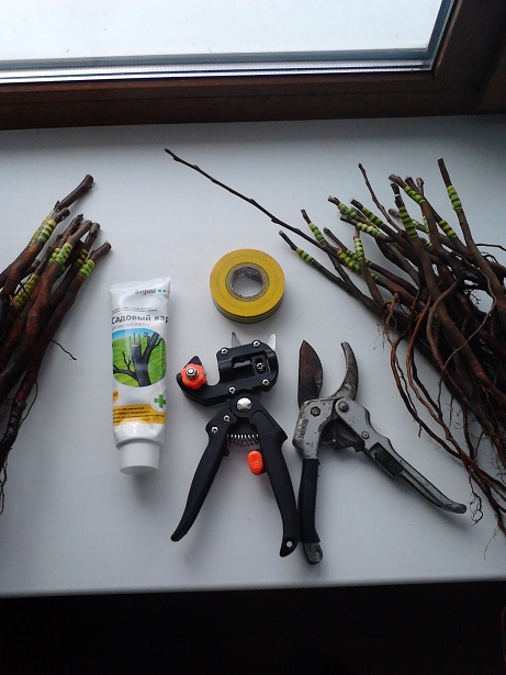 Тоже сегодня привил первые 30 груш с соседской груши. Секатором очень доволен, идеально зарезает даже тонкие прутики. Пробовал сначала не липкой стороной заматывать, плохо получается, решил клейкой стороной мотать, поставил под стол сращиваться, будем посмотреть на первый мой эксперимент по прививке.