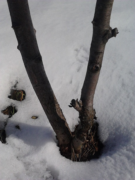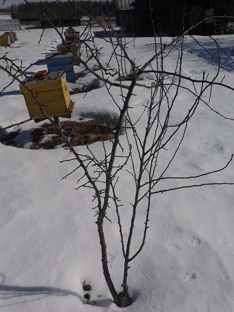Вот замёрзшая груша, в прошлом году что то от неё начало расти, не рассматривая особо, подрезал корявые ветки в низу, а оказалось при ближайшем рассмотрении растёт боярышник и груша с одного корня, думаю может так оставить, груш в этом году и так насажаю много, а боярышника нет.