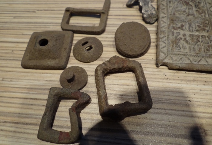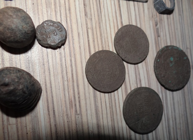 А на следующий день все остальное поднял , три двухи Н2 ,крест серебряный (видимо красивый был раньше, сохранились эмаль частично и на оборото клейма, но не разобрал пока, думаю начало 19в. изготовлен) пряги и конинка. да, и кольцо еще. очень маленькое, видимо детское. тоже подскажите что изображено на нем. материал незнаю, не свицец но и на алюминий не похож. по изготовлению вроде штамповка. могу ошибаться. Вложенные эскизы изображений -------------------- Вы, это! Пишите, если что!