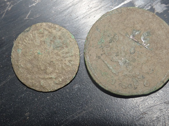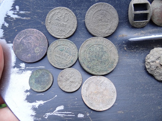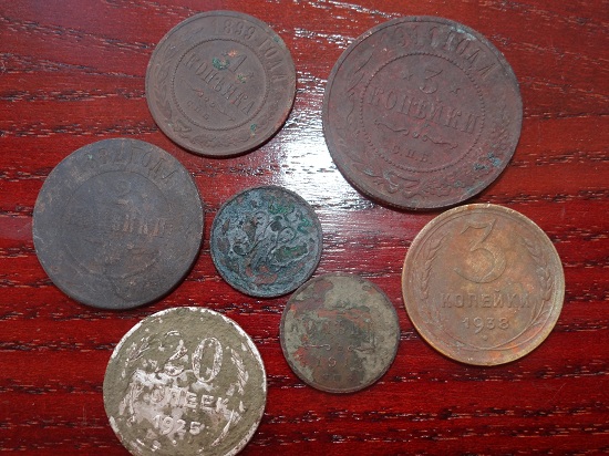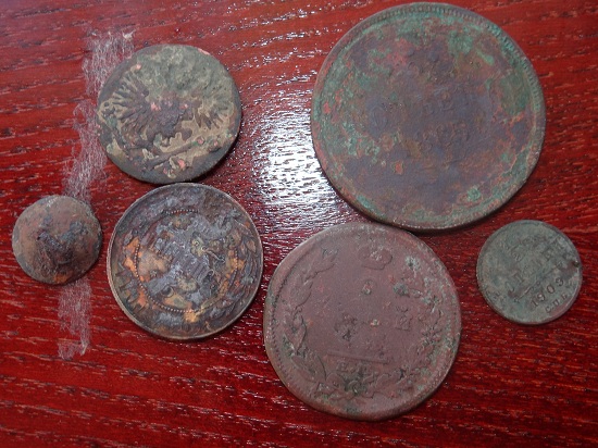 Потом как приехал к родителям в Староминскую там еще выезжал пару раз часика по 3-4. результат скромен и монетки подъубитые. Там в 1877 располагалось селение по двум берегам реки , а теперь только на одной и ребята уже 9ть лет его выбивают и я чуток урвал,но удобрения делают свое пакостное дело. фоты тоже прикрепляю,. 2 коп.1914 года числил эликтролизом- это мой первый опыт. Поднял в первый день 2коп 1914, пуговку, 5 коп. 1865 и 1/2 коп. 1909г., во второй день 2 ко. 1816 и как мне видится пуговицу с орлом и вроде пушками подскажите точно ли пуговица а какого периода времени и что за пуговка? Всем признателен за внимание.