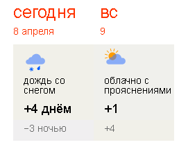 QUOTE(Доктор Са @ Apr 8 2017, 18:52) Завтра по прогнозу салат) снег с дождем Где это видно? Вложенные эскизы изображений -------------------- Мне бы шашку да коня и на линию огня..... |