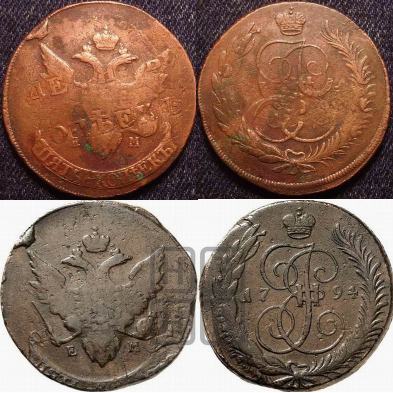 А у меня на соседнем форуме закончилась эпопея по определению моего пятикопеечника Павловского перечекана. Гуру от нумизматики признали в нём 5 копеек ЕМ 1794-го года, перечеканенного из десятикопеечника 1796-го года в 1796-97 годах на Санкт-Петербургском монетном дворе. Даже нашли фото пятака, отчеканенного этой же парой штемпелей.