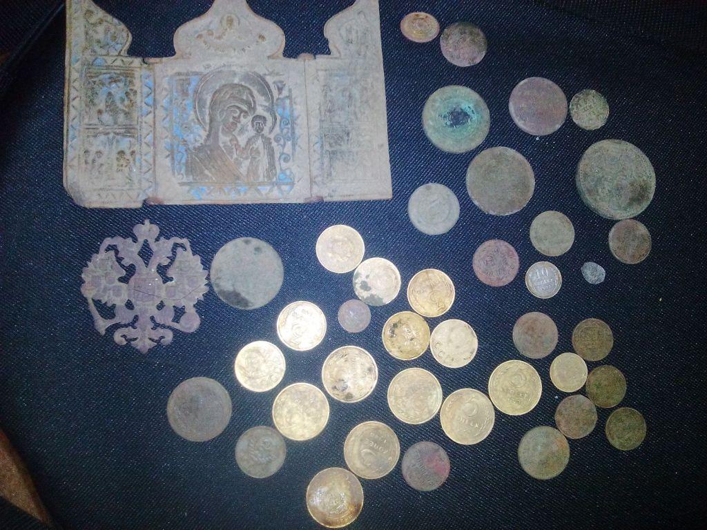 Сьездил сегодня,открыл сезон, не доезжая Гоши, урочище всё копано перекопано,ямки не закопаны, на обратном пути застрял на поле, 2 часа выбирался,пришлось домкратить,итог: запчасти самовара,пуговка с якорем,2 копейки 1881 и здоровый крестик лепесток,сил нет пошел пиво пить