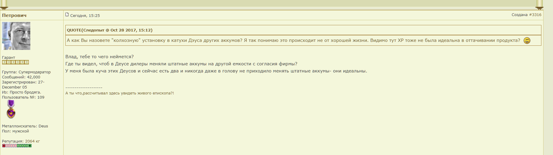 QUOTE(Ал @ Oct 28 2017, 15:41) Тёзка интроник позиционируется как убийца всего и вся, в том числе деуса, 3030 и иже с ними....и если он таким и станет то я тоже являюсь потенциальным покупателем, как и остальные деусоводы, 3030воды, траководы и т д. и т.п. и имею полное право требовать предоставить факты о том что он является таковым, так как и писать здесь своё субъективное мнение о нём, и о всем и обо всех кто с ним связан, включая не совсем удачную политику фирмы в отношениии апгрейтов, конструктиве прибора, качестве материалов а также тех, кто выступает от фирмы как тестеры......так что не надо ля-ля зы мое субъективное мнение, повторюсь субъективное мнение - Ака постоянно нас тупает на одни и те же грабли -скажите нафига так активно пиарить прибор которому до серийного выхода в готовом виде еще 2-3 года В этом вы правы. И я всего лишь имел ввиду, деусоводов начинающих здесь обсуждать аккумы деуса |