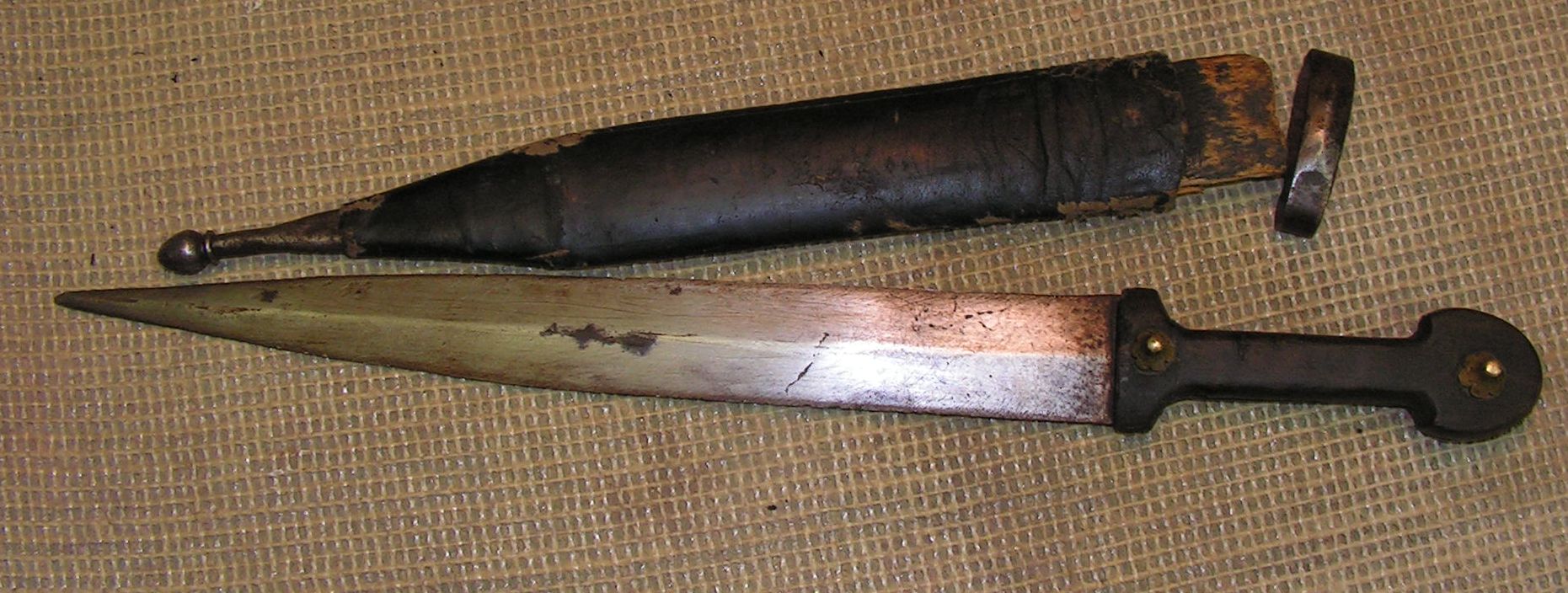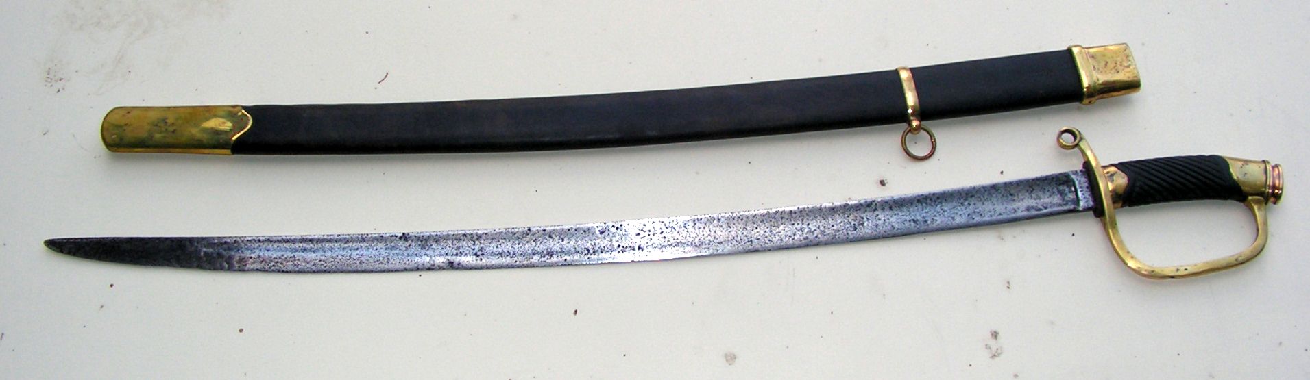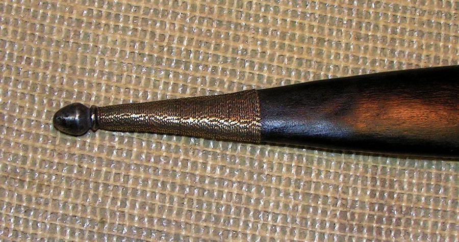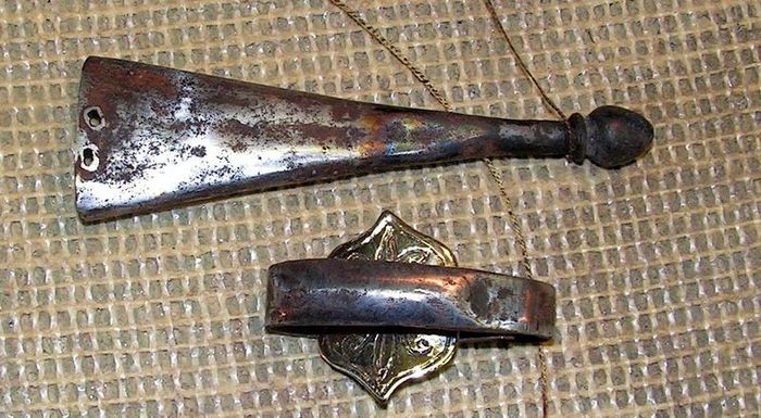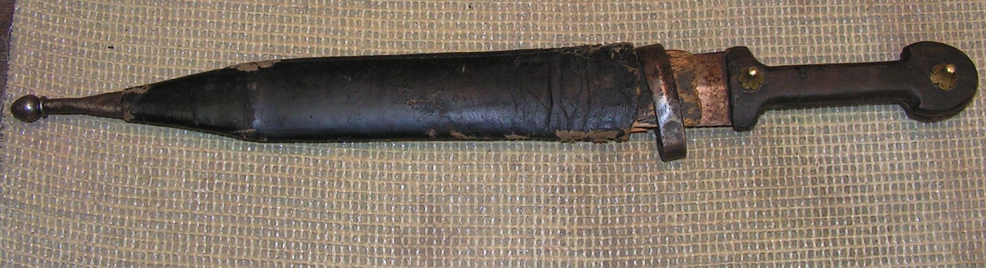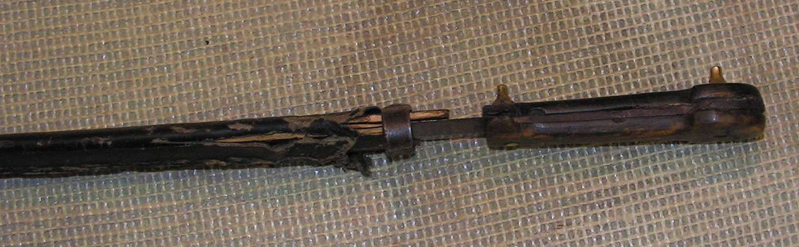 Далее были ножны, сначала я почистил фурнитуру. потом решил добавить пару элементов, это бляшку с рисунком под гайку и вымотать кончик стакана латунной витой проволокой. Сами ножны изготовлены из ивы, можно было бы сделать и из липы, и та и та не даёт сильного расширения при намокании, но решил сделать из ивы. Внутреннюю часть обработал морилкой, и выглядит старенько и не будит впитываться смазка с клинка в древесину, всякие балистолы и прочие оружейные смазки содержат щёлочь, а она разъедает древесину.