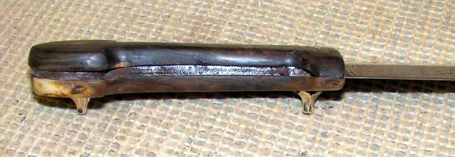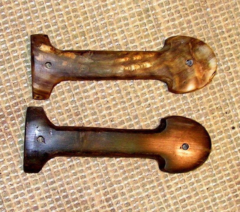 Далее были отожжены гвозди и их ножки были оттянуты методом ковки, соответственно ножки стали длиннее и гвозди остались родные. Потом монтаж щёчек, из за того, что отверстия на щёчке и буйвалиного рога просверлены были криво, на лицевую сторону я поставил щёчку из бараньего рога, та, что в оригинальном варианте стояла сзади она оказалась и ровнее и покрасивше.